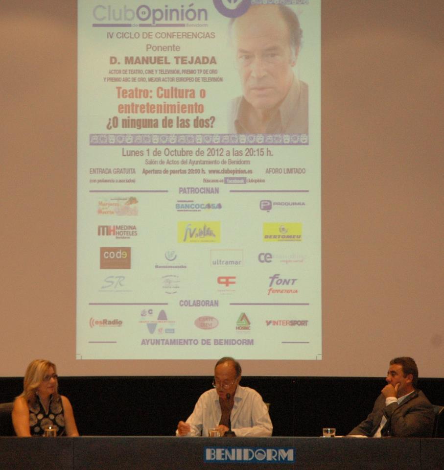 Manuel Tejada ofreció en la noche del lunes 1 de octubre un completo repaso sobre el mundo del teatro, la televisión y el cine a través de su dilatada trayectoria como actor. El Club de Opinión de Benidorm ha organizado con la presencia del actor la primera de las conferencias de este ultimo trimestre del año, y resultó todo un éxito, puesto que el Salón de Actos del Ayuntamiento de Benidorm se llenó para escuchar algunas de las enseñanzas, anécdotas y vivencias que transmitió este actor de dilatada experiencia interpretativa.