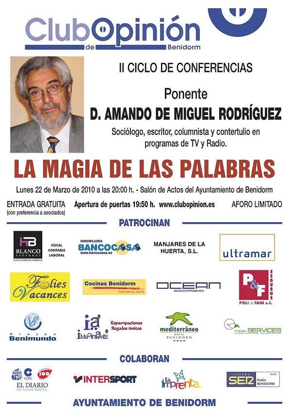 El Lunes 22 de Marzo de 2010 Don Amando de Miguel Rodríguez protagonizó la conferencia La Magia de las palabras en el Salón de Actos del Ayuntamiento de Benidorm, organizada por la asociación cultural Club de Opinión Benidorm.