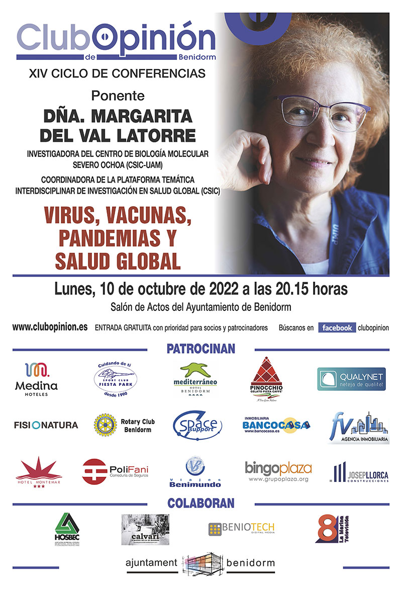 Dentro del XIV ciclo de conferencias del Club de Opinión Benidorm, continuamos con las conferencias de este año. En esta ocasión la conferencia lleva por título: «Virus, vacunas, pandemias y salud global» y contaremos con la presencia de D.ª Margarita Del Val Latorre, investigadora del Centro de Biología Molecular Severo Ochoa (CSIC-UAM) y coordinadora de la plataforma temática interdisciplinar de investigación en salud global (CSIC).